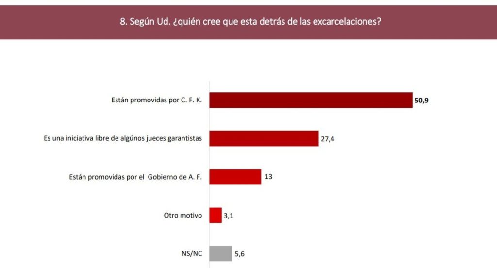 Ante la pregunta sobre las motivaciones políticas de estas excarcelaciones, un 50,9% responde que “están promovidas por Cristina Fernández de Kirchner”. Para un 27,4%, “es una iniciativa libre de algunos jueces garantistas”; y para el 13% “están promovidas por el Gobierno de Alberto Fernández”.