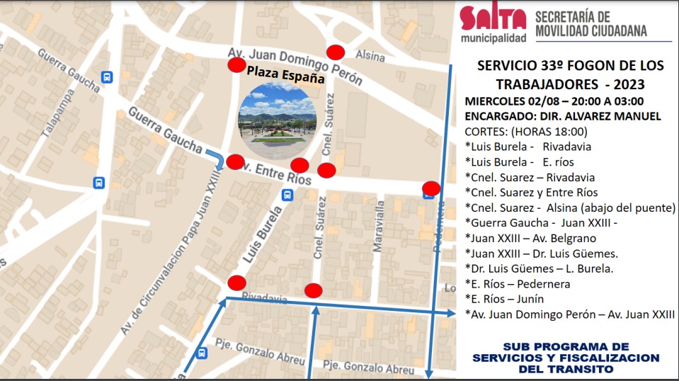 Se implementará un dispositivo de seguridad vial y controles con motivo de realizarse el 33° Fogón de los Trabajadores, festival folclórico en honor a San Cayetano, mañana en el anfiteatro e instalaciones de la plaza España, en zona oeste.
