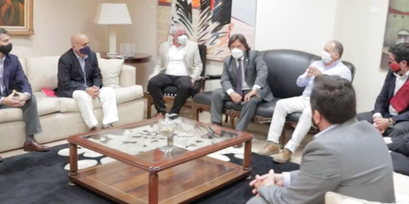 En Casa de Gobierno, el gobernador Gustavo Sáenz se reunió con el gerente general de la minera Mansfield Wilber Zamora y los gerentes Facundo Huidobro y Agustín Frezze. También participaron el coordinador de Enlace y Relaciones Políticas Pablo Outes, el ministro de la Producción y Desarrollo Sustentable Martín de los Ríos, el secretario de Minería y Energía Ricardo Alonso y el titular de Recursos Energéticos y Mineros de Salta (REMSA), Alberto Castillo.