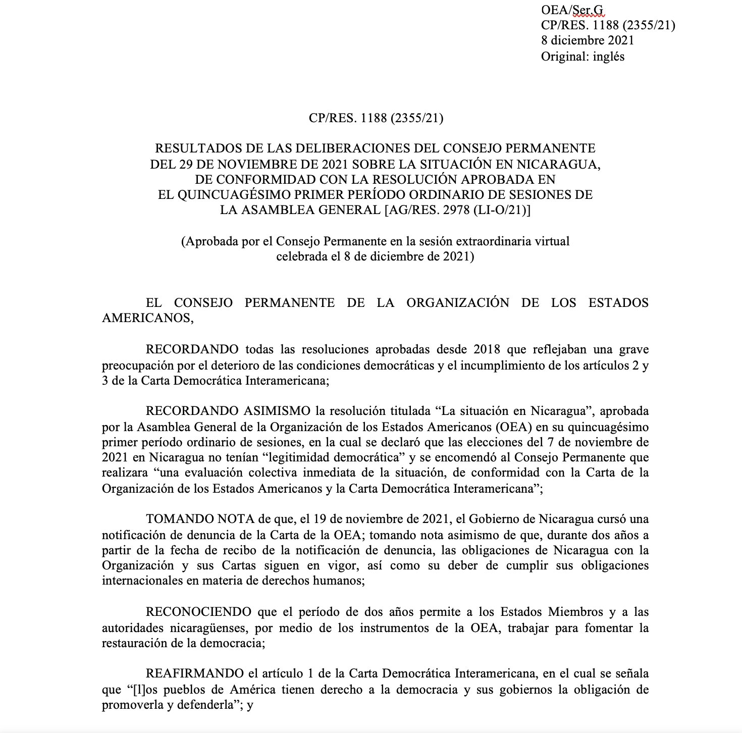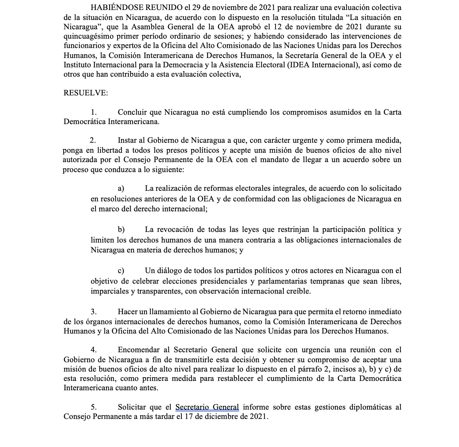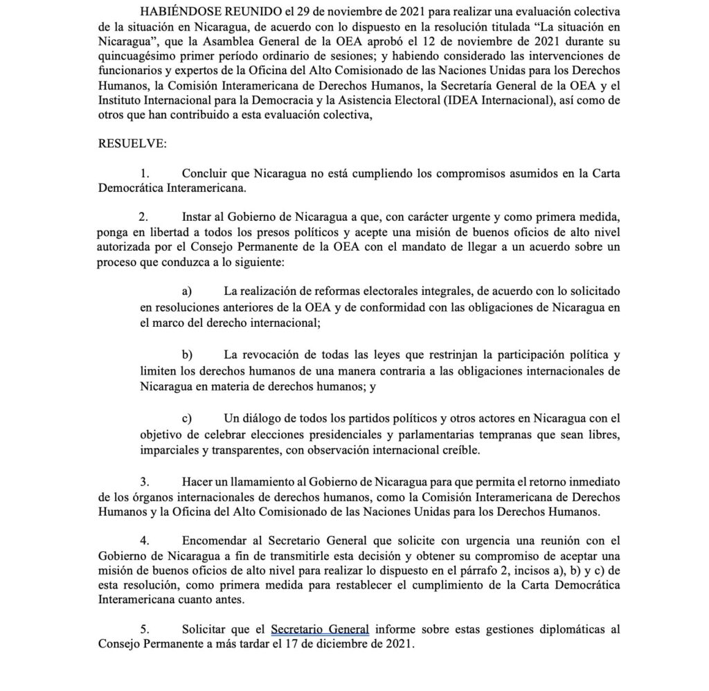 Además, resuelve “la realización de reformas electorales integrales, de acuerdo con lo solicitado en resoluciones anteriores de la OEA y de conformidad con las obligaciones de Nicaragua en materia de derechos humanos”.