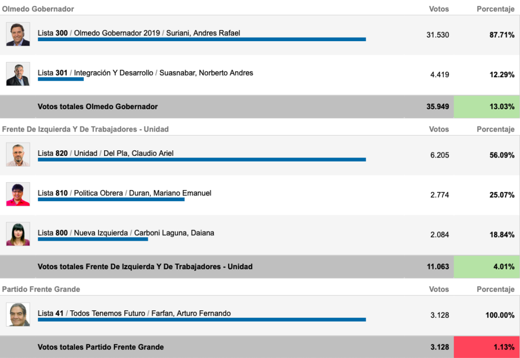Por su parte, Andrés Suriani fue el vencedor de la interna en el Frente Olmedo Gobernador, y Claudio del Plá en el Frente de Izquierda