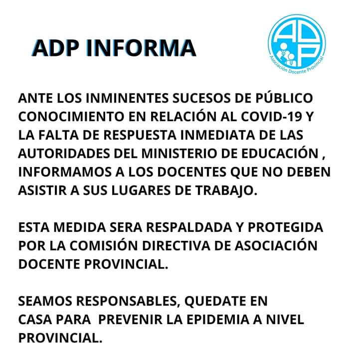 Dede la Agremiación de Docentes Provinciales (ADP) se había informado mediante un comunicado que “ante la falta de respuestas inmediatas del Ministerio de Educación” en relación al coronavirus en la provincia, se solicitaba a los docentes, que no acudan a trabajar.