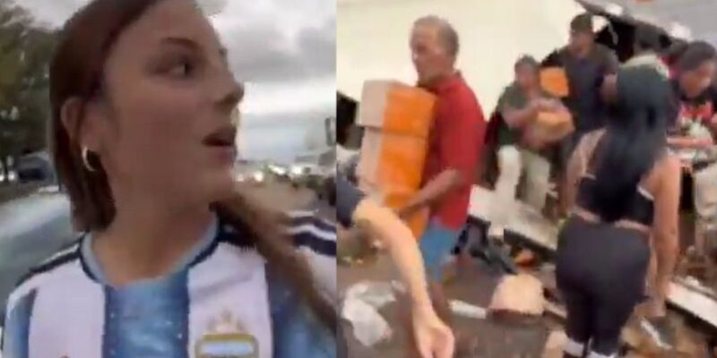 Las imágenes muestran el camión volcado de fondo y a varias personas cargando cajas y botellas. En otro tramo, ya con productos en la mano, la joven bromea: “Nos vamos con aceite de oliva… gracias Mendoza”.