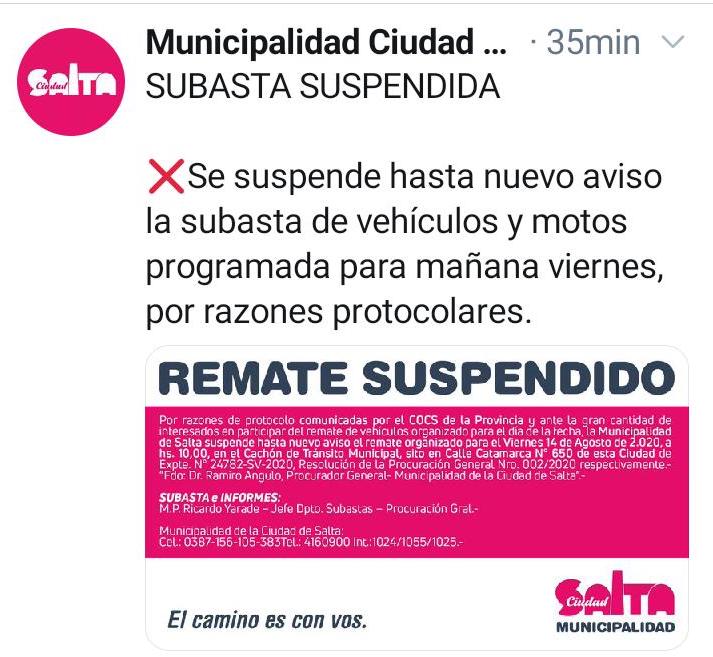 Desde el Colegio de Martilleros de Salta se presentó un reclamo ante el Comité Operativo de Emergencia de la provincia, en el que se ponía de manifiesto que este tipo de convocatorias son multitudinarias el municipio no había tomado las medidas de resguardos relacionadas con la prevención de la pandemia del Covid-19.