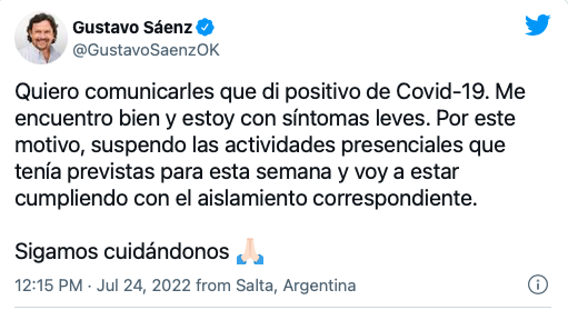 De acuerdo a lo expresado por el primer mandatario, ayer por la tarde se practico el test covid que dio positivo, por lo que se vio obligado a suspender actividades de agenda como su participación en la entronizacion de las imágenes del Milagro y la cena prevista con el embajador de Siria, entre otras