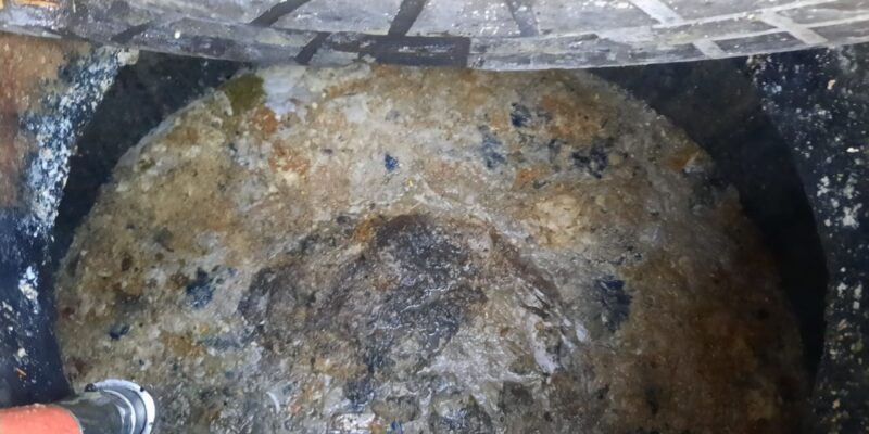 La destapar las bocas de acceso cloacal, desde la empresa se dieron con la novedad de la existencia de una gran cantidad de grasa endurecida y adherida a las cañerías, que fueron el motivo del desborde.