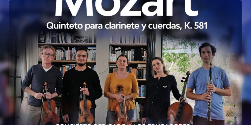 Se podrá disfrutar por el Facebook Live de la Orquesta Sinfónica de Salta. Eugenio Tiburcio en clarinete, Nicholas Robinson en violín, Lucio Luis en violín, Tetyana Larina en viola, y María Eva Sola en violonchelo, interpretarán el Quinteto para clarinete y cuerdas en La Mayor, K. 581.