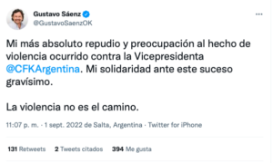 Desde todo el arco político expresaron también su solidaridad con la vicepresidenta. Es el caso del gobernador Gustavo Sáenz quien señaló: “Mi más absoluto repudio y preocupación al hecho de violencia ocurrido contra la Vicepresidenta @CFKArgentina. Mi solidaridad ante este suceso gravísimo. La violencia no es el camino”.
