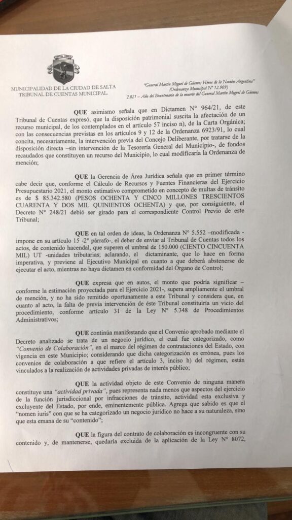 El Tribunal de Cuentas municipal emitió dictamen sobre el convenio firmado entre la Municipalidad de Salta y la empresa Cecaitra para instalar las cámaras de fotomultas.