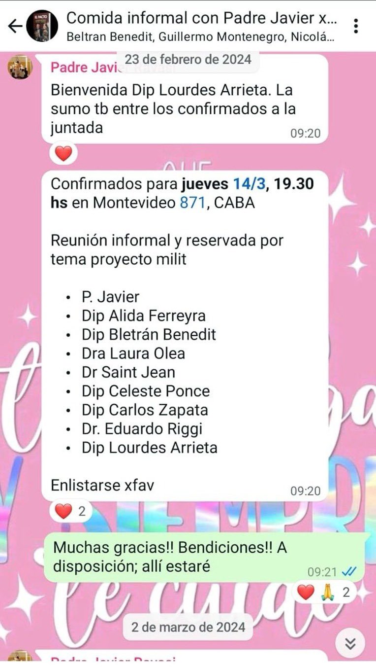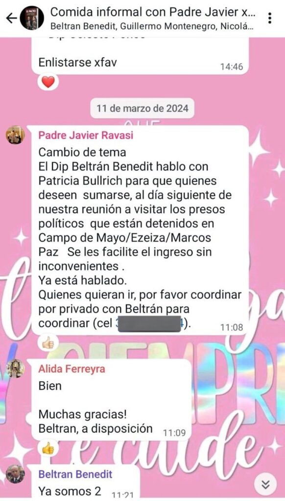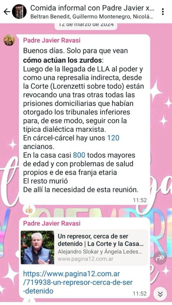 En su publicación, Arrieta detalló la creación de grupos de WhatsApp, donde se discutieron medidas para beneficiar a militares condenados por crímenes de lesa humanidad. Según Arrieta, el cura Ravasi habría convocado a una reunión privada en marzo, a la que asistieron varios diputados, abogados y un ex juez de Casación.