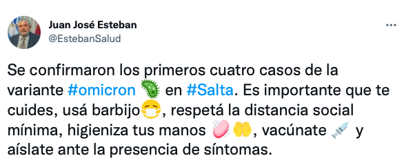 El Ministerio de Salud Pública confirmó los primeros cuatro casos de la variante Ómicron en Salta. Las muestras fueron tomadas en el hospital Señor del Milagro y, en el marco de la vigilancia genómica regular, enviadas al Instituto Malbrán para identificar el tipo de variante del virus SARS-CoV-2.