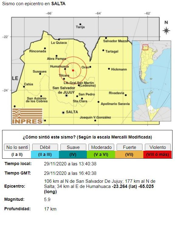 El Instituto Nacional de Prevención Sísmica (Inpres) informó que el sismo tuvo una magnitud de 5,9 en la escala de Richter y una profundidad de 17 kilómetros.