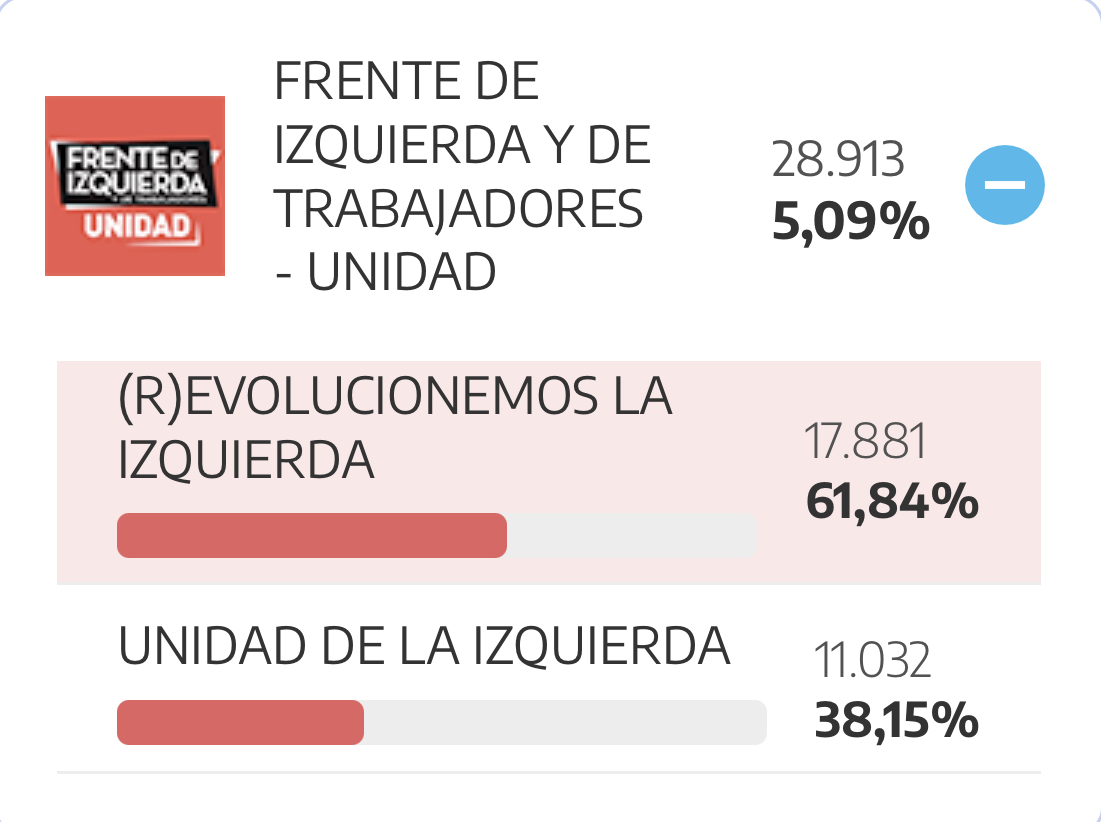 La lista (R)Evolucionemos del Frente de Izquierda Unidad, encabezada por la joven docente Andrea Villegas (MST), se impone con un 3.32% por sobre Cristina Foffani de la Unidad de Izquierda (2,05%)