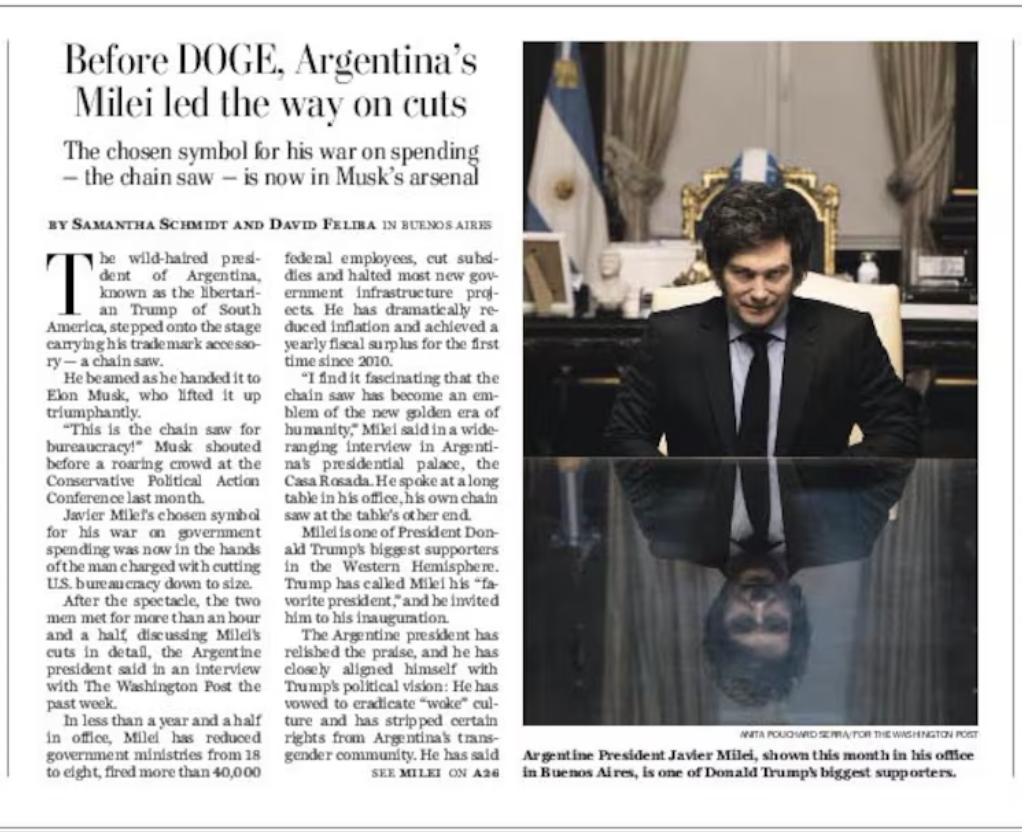 El The Washington Post publicó un artículo detallado sobre el presidente argentino Javier Milei, destacando sus drásticos recortes en el gobierno y comparándolos con las políticas de eficiencia gubernamental de Donald Trump. El artículo describe cómo Milei ha reducido los ministerios de 18 a 8, despedido a más de 40.000 empleados federales y paralizado muchos proyectos de infraestructura, todo mientras logró un superávit fiscal y redujo la inflación por primera vez desde 2010.
